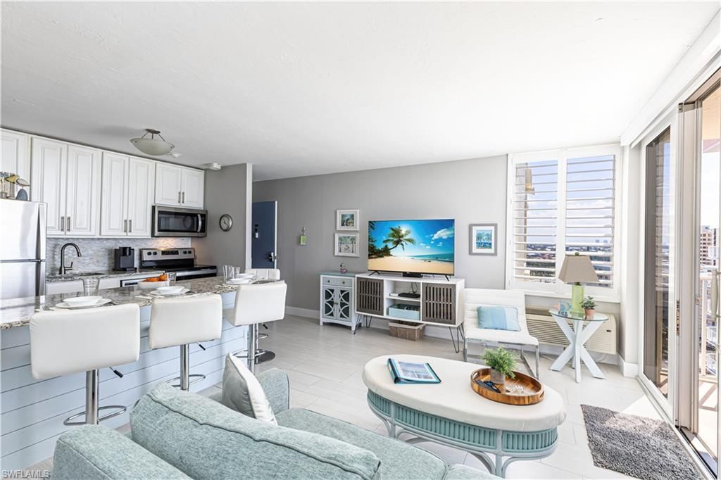 Imagine stepping into your dream beachside retreat, where every detail has been thoughtfully curated for comfort and luxury. As you enter, you're immediately greeted by the expansive Gulf views, visible through floor-to-ceiling impact-resistant windows and doors that not only frame the stunning seascape but also ensure your peace of mind. The open-concept living area boasts upgraded Italian porcelain flooring, exuding elegance and durability. To your right, a built-in desk offers a convenient workspace, seamlessly integrating functionality with style. The upgraded kitchen, adorned with a chic backsplash, invites culinary adventures, while the adjacent dining area is perfect for intimate gatherings. Natural light floods the space, enhanced by plantation shutters and a motorized sunshade, allowing you to control the ambiance with ease. As you move towards the master suite, you'll find California Closets in both the bedroom and bathroom, providing ample storage and a touch of luxury. Step out onto your private balcony, where the sound of gentle waves and the sight of breathtaking sunsets become part of your daily routine. This outdoor haven is the perfect spot to unwind, entertain, or simply soak in the serene surroundings. Rest assured, this home has been meticulously maintained by its original owners and remained untouched by water intrusion during Hurricane Ian. This residence is truly move-in ready or take advantage of the incredible income opportunity allowing weekly rentals with potential earnings of over $35,000 a year. Located directly across from the vibrant Santini Marina Plaza, you'll have immediate access to a variety of shops, dining options, and boating facilities, enhancing your coastal lifestyle. Whether you'e seeking a savvy investment opportunity or envisioning your dream beach house, this unique property offers unparalleled views, modern upgrades, and a prime location. Don't miss the chance to make this seaside sanctuary your own. Call or Text Steven Chase at 239-287-0539 for more information.